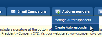 To create an autoresponder, start by moving your mouse over the "Autoresponders" tab and clicking the "Create Autoresponder" menu option, like so: