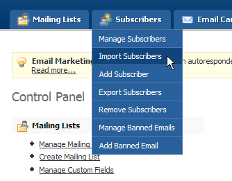 Move your mouse over the "Contacts" tab and click the "Import Contacts" option, as shown below: