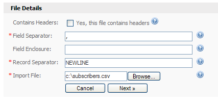 The example import file above includes three records, and each record is separated with a new line. Each record contains four fields, and each field is separated with a comma. The CSV file will typically have a .CSV or .TXT file extension. Start by clicking on the "Browse..." button in the form to select your CSV file from your hard drive: