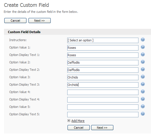 We can now create the options for the custom field. We will let the contact choose from 3 different flowers: roses, daffodils and orchids. For the sake of our demo we will use the same text for the name and value of each option.